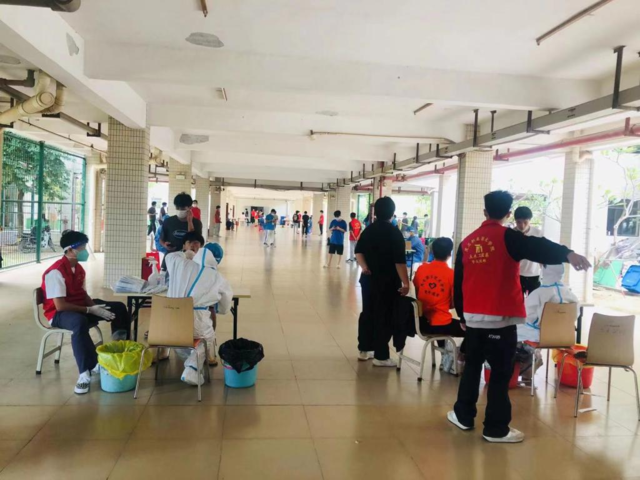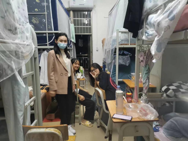 在疫情面前,在校坚守的教职工“舍小家顾大家”,活跃在校园抗疫一线。辅导员陈老师、杨老师已经在校连续奋战5天没有回家了,她们都是年轻的二胎妈妈,思念年幼孩子的心呼之欲出,但她们依然坚守岗位,恪守尽责,只因她们也是学生们可亲可信赖的“主心骨”;学校教工宿舍紧张,部分值班人员只能睡在办公室。简易极不舒服的移动床铺、渐冷的天气、紧张繁重的抗疫任务都阻挡不了教职员工坚守岗位、齐心抗疫、守护学生的决心。学生志愿者钟同学在疫情期间已连续参与多次志愿服务,或参与核酸检测、或参与清洁卫生、或参与饭堂值守等,每一次回到宿舍都会手脚酸痛。但只要有课余时间,她还是会积极报名参加。她表示,在携手抗疫的路上,能够尽一点微薄的力量,是成长路上一份宝贵的经历。看到被帮助的人脸上露出满意的笑容,看着自己所做的事情取得成效,感到非常的满足,无论多苦多累,都是值得的。